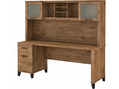 A spacious work surface and plenty of storage capacity make the Bush Furniture Somerset 72" office desk with drawers and hutch a perfect choice for your home office. Spread out with a computer and paperwork while multitasking on an expansive desktop that includes a wire management grommet to keep cords and cables in order. The desk's file drawer opens on smooth full-extension ball bearing slides for easy access to legal- and letter-size documents, while a box drawer keeps the office supplies and utensils you need close by. The hutch attaches to the desktop and adds a pair of frosted glass doors for concealed storage in addition to open cubby spaces with shelves for books, decorations, and more. This home office desk with drawers and hutch set is tested to meet ANSI/SOHO quality standards for safety and performance and is backed by the Bush Furniture 6-year manufacturer's warranty.