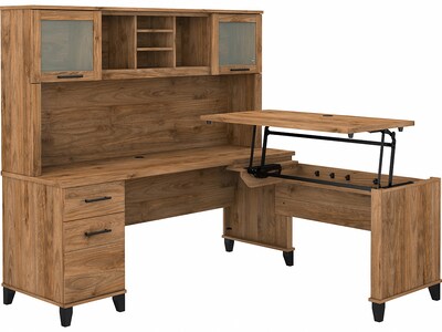 The Bush Furniture Somerset three-position sit-to-stand L-shaped desk with hutch offers an excellent solution for those seeking a stylish and functional ergonomic workspace. The built-in mechanical lift-and-lock system allows the 42"W x 24"D return to lock into place at standing heights of 35", 38", and 41" and easily return to a seated position. The office desk includes a file drawer that opens on smooth full-extension ball bearing slides for easy access to legal- and letter-size documents in addition to a box drawer for supplies and utensils. The hutch attaches to the desktop and adds two frosted glass doors for concealed storage in addition to open cubby spaces with two shelves. Fixed surfaces are tested to meet ANSI/SOHO standards for safety and performance while the mechanical lift is rigorously tested to Bush Furniture quality standards.