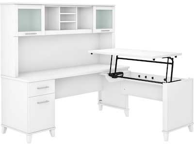 The Bush Furniture Somerset 72"W three-position sit to stand L-shaped desk with hutch offers a perfect solution for those seeking for a stylish and functional ergonomic workspace. The built-in mechanical Lift-n-Lock system allows the desktop to lock into place at standing heights of 35", 38", and 41" and easily return to a seated position. This office desk includes a file drawer that opens on full-extension ball bearing slides for easy access to legal- and letter-size documents and a box drawer for supplies and utensils. The hutch attaches to the desktop and adds two frosted glass doors for concealed storage in addition to open cubby spaces with two shelves. Fixed surfaces are tested to meet ANSI/SOHO standards for safety and performance while the mechanical lift is rigorously tested to Bush Furniture quality standards.
