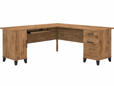 Maximize the potential of your home office with the Bush Furniture Somerset 72"W L-shaped desk. Create your remote work headquarters with space for a computer, phone, printer, and more on a surface that features wire management slots for keeping cords and cables in order. A convenient pull-out shelf provides a perfect place to keep a keyboard or laptop, and the desk also includes a vertical storage cabinet with an adjustable shelf. Place pens, paper, and more in the box drawer, and enjoy a file drawer gliding on smooth ball bearing slides for an easy reach to documents. Transitional styling includes a stylish finish with tapered legs and contemporary metal hardware for an alluring appearance. This desk with storage is tested to meet ANSI/SOHO standards for safety and performance and is backed by the 6-year manufacturer warranty. American-made with US and imported parts.