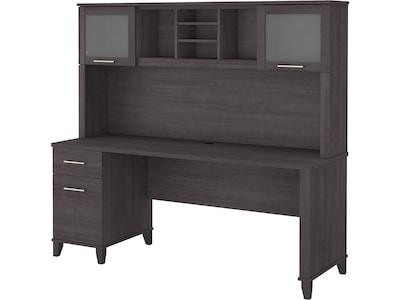 The transitional Bush Furniture Somerset 71" office desk with hutch offers a stylish and practical workspace solution for the home or small office. A spacious work surface and plenty of storage capacity make this desk with drawers and hutch a perfect choice for your home office. Spread out with a computer and paperwork while multitasking on an expansive desktop that includes a wire management grommet to keep cords and cables in order. The desk's file drawer opens on smooth full-extension ball bearing slides for easy access to legal- and letter-size documents, while a box drawer keeps the office supplies and utensils you need close by. The hutch attaches to the desktop and adds a pair of frosted glass doors for concealed storage in addition to open cubby spaces with two shelves for books, decorations, and more. This home office desk with drawers and hutch set is tested to meet ANSI/SOHO quality standards for safety and performance and is backed by the Bush Furniture 6-year manufacturer warranty.