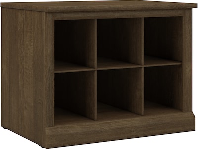 The Bush Furniture Woodland 24W Small Shoe Bench with Shelves combines transitional styling and a practical design to offer an ideal entryway organizer. Have a seat on the durable bench surface and take a moment to relax as you get ready to head out the door or come home after a long day. The top of the mudroom bench supports up to 250 pounds, so you can sit down to put on and take off your shoes or set bags down after a trip to the store with confidence. Six built-in cubby spaces keep your home's entrance organized while providing easy access to footwear and accessories. The storage bench's transitional design blends elements of contemporary and traditional styling to complement a wide range of home furnishings. This small entryway bench with storage has been rigorously tested to meet Bush Furniture's standards for safety, performance and durability and is backed by a 3 Year Warranty.