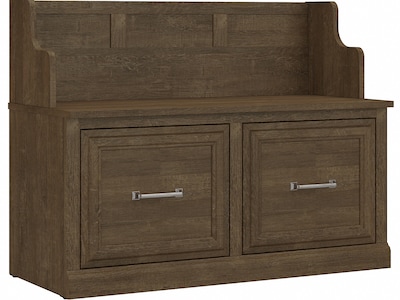 The Bush Furniture Woodland 40W Entryway Bench with Doors combines transitional styling and a practical design to offer an ideal shoe storage solution. Have a seat on the durable shoe bench surface and take a moment to relax as you get ready to head out the door or come home after a long day. The top of the mudroom bench supports up to 250 pounds, so you can sit down to put on and take off your shoes or set shopping bags down after a trip to the store with confidence. Cabinet doors conceal two internal compartments that keep footwear in order and out of sight. The entryway organizer's transitional design blends elements of contemporary and traditional styling to complement a wide range of home furnishings. This storage bench with back has been rigorously tested to meet Bush Furniture's standards for safety, performance and durability and is backed by a 3 Year Manufacturer's Warranty.