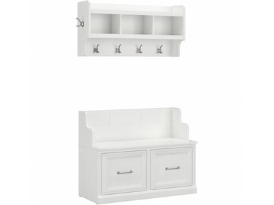 The Bush Furniture Woodland 40W Entryway Bench with Doors and Wall Mounted Coat Rack combines transitional styling and a practical design to offer an ideal storage solution. Have a seat on the durable shoe bench and take a moment to relax as you get ready to head out the door or come home after a long day. The top of the mudroom bench supports 250 pounds, so you can sit down to put on and take off your shoes or set shopping bags down with confidence. Cabinet doors conceal two internal compartments that keep footwear in order and out of sight. The wall shelf includes six coat hooks for hanging jackets, hats, scarves and more. Smaller items like gloves and keys can be stashed neatly inside three open cubby spaces. This Entryway Bench and Coat Rack has been tested to meet Bush Furniture's standards for safety, performance and durability and is backed by a 3 Year Manufacturer's Warranty.