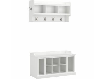 The Bush Furniture Woodland 40W Shoe Storage Bench with Shelves and Wall Mounted Coat Rack combines transitional styling and a practical design to offer an ideal entryway organizer. Have a seat on the durable bench surface and take a moment to relax as you get ready to head out the door or come home after a long day. The top of the mudroom bench supports 250 pounds, so you can sit down to put on and take off your shoes or set shopping bags down with confidence. Six cubby spaces and vertical shelves on either side keep footwear of all shapes and sizes in order. The wall shelf features six coat hooks for hanging jackets, hats, scarves and more. Smaller items like gloves and keys can be stashed neatly inside three open compartments. This entryway bench and coat rack has been tested to meet Bush Furniture's standards for safety, performance and durability and is backed by a 3 Year Warranty.