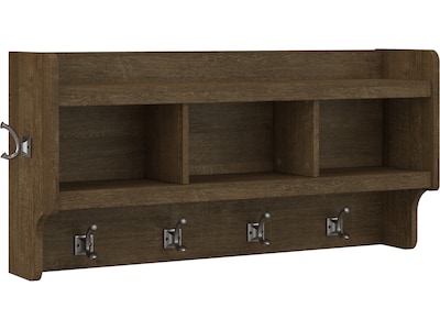 The Bush Furniture Woodland 40W Wall Mounted Coat Rack with Shelf combines transitional styling and a practical design to offer an ideal entryway organizer. Store outerwear and other daily essentials in one convenient location so that everything is right where you need it when it's time to head out the door again. The wall shelf includes four coat hooks in the front and one on each side for hanging jackets, hats, scarves and more. Smaller items like gloves and keys can be stashed neatly inside three open cubby spaces while the top shelf provides an area to brighten up your entryway with decorations. Coat hooks support up to 15 pounds, and the total weight capacity of the wall mounted shelf is 25 pounds. This entryway wall organizer has been rigorously tested to meet Bush Furniture's standards for safety, performance and durability and is backed by a 3 Year Manufacturer's Warranty.