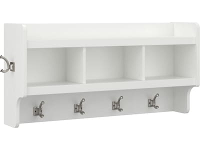 The Bush Furniture Woodland 40W Wall Mounted Coat Rack with Shelf combines transitional styling and a practical design to offer an ideal entryway organizer. Store outerwear and other daily essentials in one convenient location so that everything is right where you need it when it's time to head out the door again. The wall shelf includes four coat hooks in the front and one on each side for hanging jackets, hats, scarves and more. Smaller items like gloves and keys can be stashed neatly inside three open cubby spaces while the top shelf provides an area to brighten up your entryway with decorations. Coat hooks support up to 15 pounds, and the total weight capacity of the wall mounted shelf is 25 pounds. This entryway wall organizer has been rigorously tested to meet Bush Furniture's standards for safety, performance and durability and is backed by a 3 Year Manufacturer's Warranty.