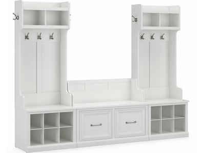 The Bush Furniture Woodland Entryway Storage Set with Hall Trees and Shoe Bench with Doors combines transitional styling and a practical design to offer an ideal organization solution. Have a seat on the durable storage bench and take a moment to relax as you get ready to head out the door or come home after a long day. Each section of the long mudroom bench supports 250 pounds, so you can sit down to put on and take off your shoes with confidence. Two small storage cabinets and cube shelving to the left and right accommodate footwear and accessories for a clutter-free entryway, mudroom or foyer. The narrow hall trees each include three coat hooks in the front and one on each side for hanging jackets, hats, scarves and more. This entryway bench and coat rack set has been tested to meet Bush Furniture's standards for safety, performance and durability and is backed by a 3 Year Warranty.