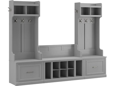 The Bush Furniture Woodland Entryway Storage Set with Hall Trees and Shoe Bench with Drawers combines transitional styling and a practical design to offer an ideal organization solution. Have a seat on the durable storage bench and take a moment to relax as you get ready to head out the door or come home after a long day. Each section of the long mudroom bench supports 250 pounds, so you can sit down to put on and take off your shoes with confidence. Vertical and cube shelving along with two small drawers to the left and right accommodate footwear and accessories for a clutter-free entryway, mudroom or foyer. The narrow hall trees include three coat hooks in the front and one on each side for hanging jackets, hats, and more. This entryway bench and coat rack set has been tested to meet Bush Furniture's standards for safety, performance and durability and is backed by a 3 Year Warranty.