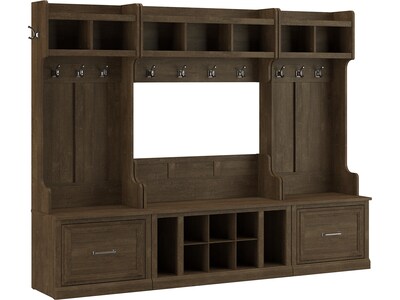 The Bush Furniture Woodland Full Entryway Storage Set with Coat Rack and Shoe Bench with Drawers combines transitional styling and a practical design to offer an ideal organization solution. Have a seat on the storage bench and take a moment to relax as you get ready to head out the door or come home after a long day. Each section of the long mudroom bench supports 250 pounds, so you can sit down to put on and take off shoes with confidence. Vertical and cube shelving along with two small drawers accommodate footwear and accessories for a clutter-free entryway, mudroom or foyer. The narrow hall trees and wall mounted shelf include a total of 10 coat hooks in the front and one on each side for hanging jackets, hats, and more. This entryway bench and coat rack set has been tested to meet Bush Furniture's standards for safety, performance and durability and is backed by a 3 Year Warranty.