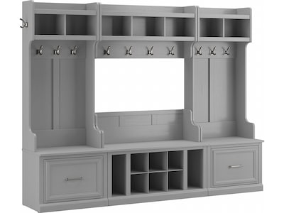 The Bush Furniture Woodland Full Entryway Storage Set with Coat Rack and Shoe Bench with Drawers combines transitional styling and a practical design to offer an ideal organization solution. Have a seat on the storage bench and take a moment to relax as you get ready to head out the door or come home after a long day. Each section of the long mudroom bench supports 250 pounds, so you can sit down to put on and take off shoes with confidence. Vertical and cube shelving along with two small drawers accommodate footwear and accessories for a clutter-free entryway, mudroom or foyer. The narrow hall trees and wall mounted shelf include a total of 10 coat hooks in the front and one on each side for hanging jackets, hats, and more. This entryway bench and coat rack set has been tested to meet Bush Furniture's standards for safety, performance and durability and is backed by a 3 Year Warranty.