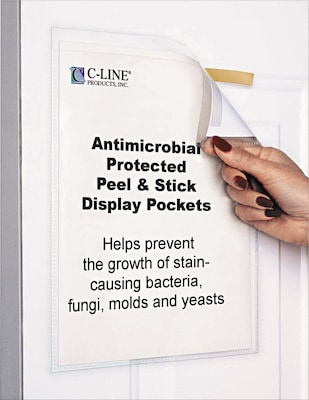 Removable peel and stick tape-backed polypropylene holders attach to walls, doors, etc. to display phone lists, schedules and more. Peel off the tape backing and stick the pocket where you need it. The holders can peel off and reposition easily. Adhesive will not mar delicate surfaces. Convenient drop-front allows for easy loading. Holds 8.5" x 11" documents.