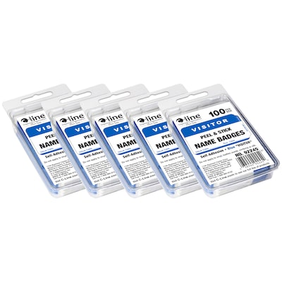 Keep track of visitors to your facility and make them feel welcome. Pressure sensitive Visitor name badges are ideal for small meetings, seminars and conferences. Unique tabbed edge makes it easy to peel off backing paper and apply. Overall badge size: 3 1/2 x 2 1/4. Do not apply to vinyl, leather, suede, corduroy or silk. Blue. Visitor. Each pack inlcudes 100. Sold as 5 packs for a total of 500 name badges.