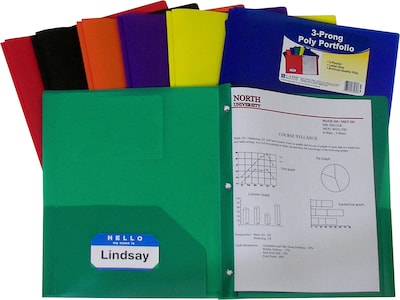 Two-pocket heavyweight polypropylene portfolios/folders with prongs hold papers and resist tearing. Features business card slot. Assorted primary colors include red, orange, yellow, green, blue, purple and black. Includes 36 portfolios.