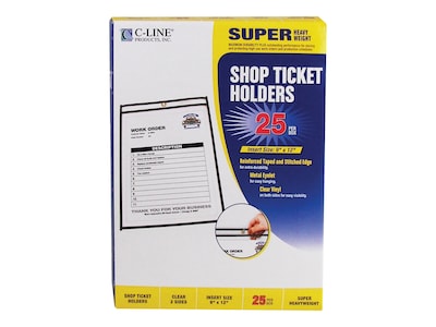 Assign repair work, manage invoices, or display important information with these job/shop ticket holders. The rigid vinyl construction stands up to everyday wear and tear, while the reinforced, stitched edges prevent ripping and splitting to keep documents neatly stored inside. These C-Line clear job/shop ticket holders feature a smooth, wipe-clean surface, which works with dry-erase markers.
