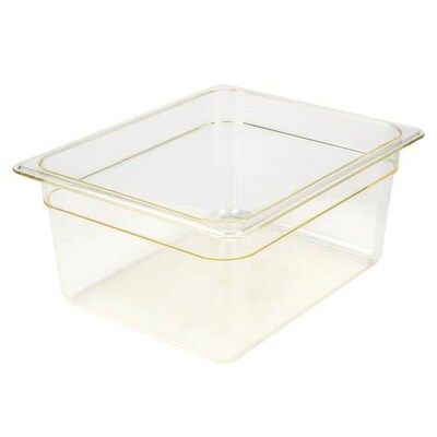 This amber Cambro 26HP150 H-Pan 6" deep, 1/2 size high heat food pan is perfect for holding high heat and freezing foods in any commercial kitchen. It's built with strong, durable materials to withstand extreme temperatures from -40 to 300 degrees Fahrenheit and will help maintain your food's temperature after it's taken out of the oven or freezer. This high heat food pan's convenient, non-stick smooth interior surface increases yields and promotes easy cleaning. To aid in storage, transport, and create more usable space, this pan will even stack with similar items without wedging or sticking.