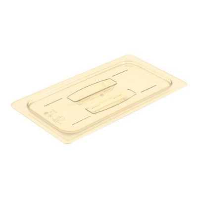 This amber Cambro 30HPCH150 H-Pan 1/3 size high heat handled lid is perfect for holding high heat and freezing foods in any commercial kitchen. It's built with strong, durable materials to withstand extreme temperatures from -40 to 300 degrees Fahrenheit and will help maintain your food's temperature after it's taken out of the oven or freezer. To aid in storage and transport, this flat cover conveniently stacks with similar items to create more usable space.