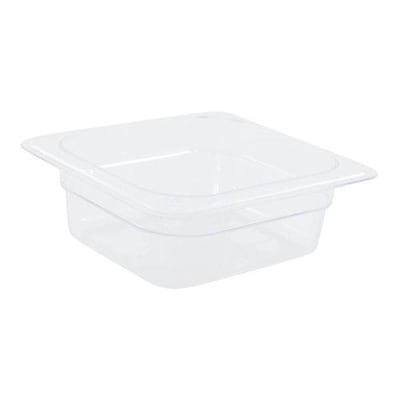 Ensure efficiency while increasing food safety in your establishment with this Cambro 62CW135 Camwear 2 1/2" deep clear 1/6 size food pan! Built to withstand temperatures from -40 to 210 degrees Fahrenheit, and made of virtually-unbreakable Camwear polycarbonate, this food pan is designed to last even in the toughest commercial kitchens. This pan won't crack, bend, or dent. Use it to store, transport, and serve all from the same pan - the clear complexion offers an easy-to-see option, while molded-in graduations in standard and metric measurements promote easy inventory management. A uniform 1/2" flange on this pan ensures a smooth fit in prep tables and food bars while a textured bottom resists scratching under everyday conditions. Inside the pan, a non-stick, smooth interior surface promotes easy cleaning while increasing yields, and a large radius bottom limits food waste. This pan won't react to food, minimizing the risk of a potentially hazardous chemical or acidic reaction. Plus, tests prove that Camwear food pans keep product as cold as stainless steel pans, with less condensation. This means your fresh produce stays fresher, longer, saving you money in the long run! When not in use, this pan stacks neatly without wedging or sticking to other pans.