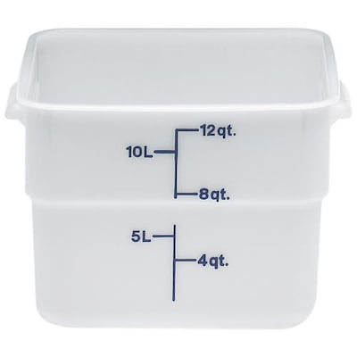 Safely store your products with this Cambro 12SFSP148 12 Qt.. square food storage container! This food storage container is made of impact resistant solid white plastic that won't be stained or harmed by food acids, oils, and alcohol. Thanks to its square shape, this container can be conveniently packed onto shelves without wasting space, while its easy-to-read midnight blue-colored gradations allow you to manage your inventory at a glance. This square container can withstand temperatures from -40 to 210 degrees Fahrenheit, ensuring its safe use in both refrigerators and freezers.