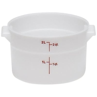 Round storage containers are ideal for storing soups, chilies, sauces, and dips! This 2 quart round storage container is chemical, impact, and stain resistant making it exceptionally easy to clean and maintain. Need quality food storage Cambro is happy to present you with this versatile, high endurance, quality 2 quart round storage container. This 2 Qt. round storage container is constructed of heavy duty polyethylene and is able to store ingredients up to 140 degrees. You can also use your round storage containers in the freezer! For use with both warm and cold foods and ingredients this round storage counter is completely versatile and are an excellent investment for any kitchen. Featuring a translucent finish with red imprinted graduations, this 2 quart round storage container is ideal for no nonsense measuring and mixing! Bring quality round storage containers to your kitchen today.
