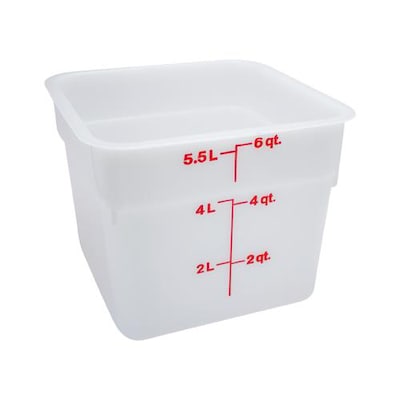 Maximize your storage space with this white 6 Qt. CamSquare container made of impact, stain and chemical-resistant polyethylene. It has easy-to-read red graduations on the outside that let you take inventory at a glance, and you can pair this container up with the matching color-coded lid to keep things even better organized. This container withstands temperatures from -40 degrees F to 160 degrees F, making it good for both hot and cold food.WARNING: This product contains a chemical known to the State of California to cause birth defects or other reproductive harm.