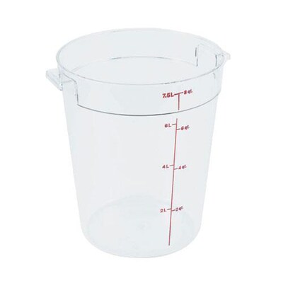 This Cambro RFSCW8135 Camwear 8 Qt.. round food storage container is made of crystal clear, virtually unbreakable polycarbonate that won't be stained or harmed by food acids, oils, or alcohol. Complete with easy to read imprinted graduations on the outside, it's simple to see how much is in each container. After washing, place it upside down to dry. The molded-in holes in the handles make sure they don't retain water. The temperature range on this container is -40 degrees Fahrenheit to 210 degrees Fahrenheit, making it perfect for use in refrigerators and freezers. Attach the lid (sold separately) to keep your ingredients and food fresh and ready to use.