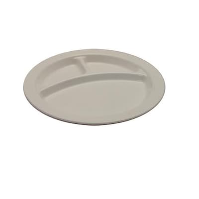 The Cambro 93CW148 white Camwear 9" three compartment plate is perfect for cafeterias, day care centers, and hospitals. Thanks to its various compartments, you can keep entrees and side dishes separate while you eat. In addition, its textured polycarbonate surface resists scratches, stains, and odors for long, consistent use. Use this dish to keep the buffet line moving during busy school lunches or during the daily rushes at healthcare facilities. Then, when the day is through you can easily stack the plates for convenient, out of the way storage! Plus, this plate's easy to clean material will make clean up quick and efficient.