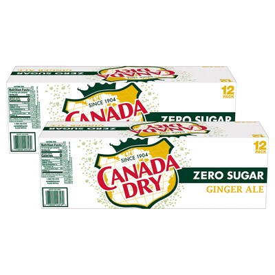 Serve a flavorful carbonated beverage to guests or visitors with this zero sugar ginger ale. They're packaged in 12-ounce cans for convenient dispensing, and the zero calorie, real ginger formula of this 24-pack of Canada Dry ginger ale makes it a healthy beverage choice.