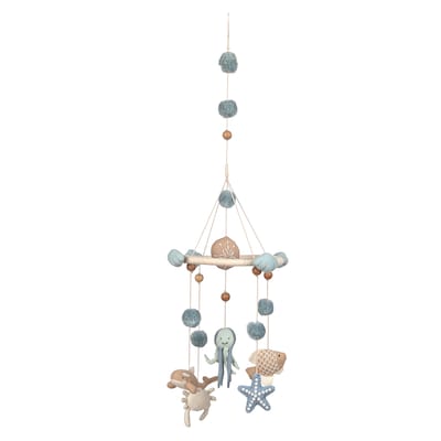 Transform your baby's nursery into a serene underwater paradise with the Crane Baby Ocean Dreams Nursery Mobile. This handcrafted hanging crib mobile features adorable sea creatures, including a smiling octopus, a playful crab, a friendly fish, and a charming starfish, all in soothing blue and beige tones. Each piece is meticulously designed to captivate your little one's attention and promote visual stimulation.
