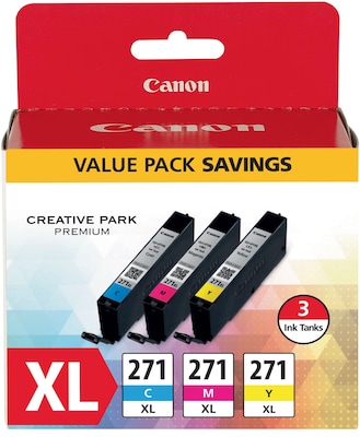 Deliver legible text and sharp graphics with these tricolor ink tanks. Effortless to install in select PIXMA printers, these tanks feature smart LED alerts to monitor ink levels for replacement. These Canon CLI-271 XL C/M/Y ink tanks are genuine Canon parts, offering quick, easy replacement so you can get back to work.