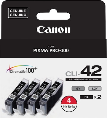 Load your printer with this 4-pack of Canon CLI-42 black, gray and light gray ink tanks to create brilliant reproductions of text, photos and other images. These tanks are compatible with Canon PIXMA printers, letting you install them in minutes for seamless operation. Proactive alert technology with these Canon CLI-42 ink tanks ensures you're never without a refill.