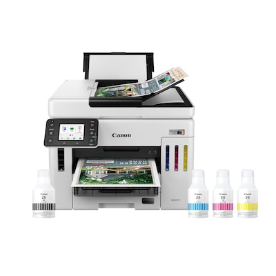 The Canon MegaTank GX7120 Wireless Home & Office All-In-One Printer is designed to meet the needs of small offices by delivering high-quality, low-cost printing, and outstanding wireless connectivity. Get serious print productivity with a high page yield of up to 6,000 Black and 14,000 Color pages per full ink bottle set and a combined 600 sheet plain paper capacity. Save up to 80% on the cost of ink compared to high-yield laser cartridges with a low cost per print of less than 2 cents per page. Each printer comes with a full set of ink, and a 3-year or 80,000 pages limited warranty so you can print with confidence.