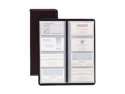 Keep payment cards and contacts in one place with this black card file that holds up to 96 total cards. This Cardinal card file features non-glare vinyl pages that can hold up to eight cards each.