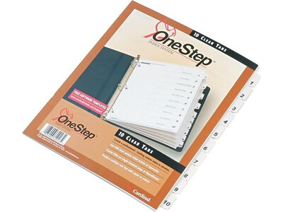 Keep important information organized with this Cardinal OneStep 1-10 tab index system. The set has matching preprinted tabs that can be used in both vertical or landscape formats, while the dividers help you find documents fast. This Cardinal OneStep 1-10 tab index system is white and can be custom-designed, so everything looks exactly the way you want it.