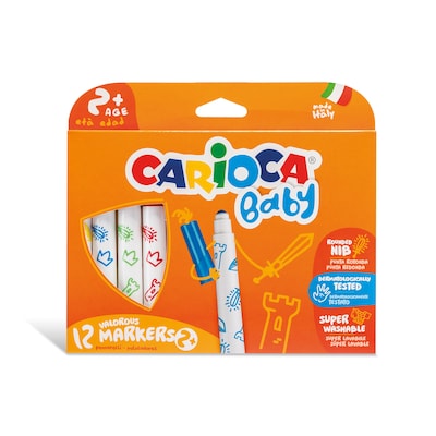 The Carioca BABY Valorous Marker: 12 Piece set is specially designed for little hands, making it perfect for children aged 24 months and up. Each marker features: rounded, locked tip for maximum safety, while the ergonomic large body allows for easy grip and effortless coloring over larger surfaces. The super-washable, non-toxic ink cleans off skin and fabrics using only water, no soap required. Dermatologically tested, these markers ensure safe, worry-free creative play, helping young artists explore color and develop their skills.