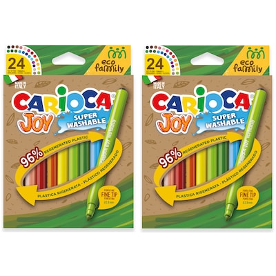 The Carioca Eco Family Joy Fine Tip Felt Tip Pens: 24 Pieces combine eco-conscious design with vibrant, precise coloring. Made from 98% regenerated plastic, these markers are an environmentally friendly choice for artists of all ages. The fine 2.8 mm blocked tip is perfect for detailed work while remaining durable for long-lasting use. With super washable ink, cleanup from skin and most fabrics is quick and easy, and the ventilated cap adds an extra layer of safety. Proudly made in Italy, these markers deliver quality, precision, and sustainability in every stroke. Each pack includes 24 markers. Sold as: packs for: total of 48 markers.