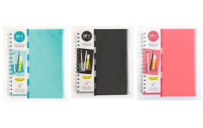 The Carolina Pad Zip-It notebook features a slide zipper front pocket cover. Perfect for storing small notes, business cards, USB drives, etc. The notebook measures 8.75'' x 7'', making it the perfect size for school and work. There are 120 college-ruled perforated sheets and two interior dividers. The front cover is durable poly and the back is heavy-duty board. The binding consists of twin nylon-coated wire.