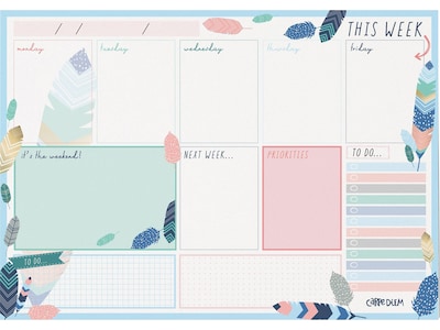 All products by Carpe Diem are cute, simple, and helpful. They are designed to inspire you to live your most organized and beautiful life. Do you struggle with organizing your week? If so, the Carpe Diem Feathers collection weekly planner pad is perfect for you. Keep on track of your daily tasks, to-dos, and priorities using this handy planner pad. Measuring 11.7" x 8.3", the pad includes a range of sections for planning your week, including a to-do list, section for notes, priorities for the week, next week to-dos, and sections for the weekdays and the weekend. Contains 60 tear-away pages made of 100gsm paper.