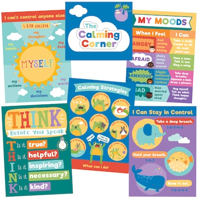 The 7-piece Calming Strategies Bulletin Board Set is designed with soothing colors and features ways for students to deal with negative emotions. Inspirational bulletin board sets are perfect for adding motivation to any area of your classroom. Designed for versatility, these sets are ideal for creating several small displays or one large display. Look for coordinating products to accent your displays and create a cohesive classroom theme.