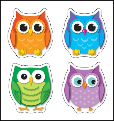 Carson-Dellosa Colorful owls shape stickers for all grades are acid and lignin free. Stickers with die-cut shapes are ideal for reward or recognition, sold as 72 stickers per pack.