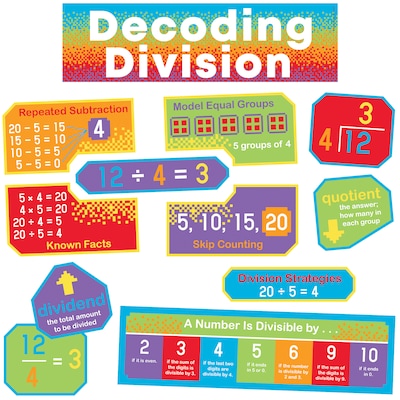 Enhance the way you teach with the 15-piece Decoding Division Mini Bulletin Board for grades 3–5. This set provides a visual reference year-round for students to learn key concepts and strategies of division.
