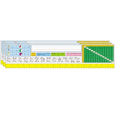 These Modern Cursive nameplates include a name line; modern cursive alphabet (uppercase and lowercase) with stroke lines; 0-12 multiplication table; place value chart with words, fractions, and numerals; fraction and decimal equivalents; and standard and metric rulers. Each nameplate is 18" x 4". Each pack includes 36 nameplates. Sold as 3 packs for a total of 108 nameplates.