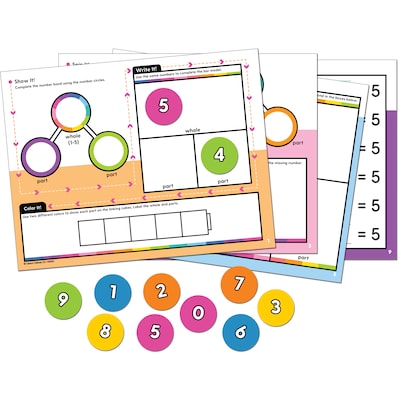 The Edu-Clings Silicone Center: Number Bonds will support students as they work with foundational addition and subtraction skills such as composing and decomposing numbers, part-part-whole, and making 10. This easy-to-clean, 21-piece resource provides a revolutionary hands-on learning experience for both at home or in the classroom. Each dry-erase mat measures 8.5 inches x 11 inches, with each manipulative measuring approximately 1.97 inches in diameter.Edu-Clings are the perfect hands-on learning manipulatives. They encourage discovery and deeper understanding at home and in the classroom. The innovative silicone material is easy to clean, quiet, durable, and clings to all nonporous surfaces without leaving any residue. It's dishwasher safe so you can sanitize regularly and easily. You can even write on it with dry-erase markers! Warm water and a touch of dish soap will always make it cling like new. From individual center activities to larger manipulatives that are perfect for whiteboards, Edu-Clings will revolutionize hands-on learning at home and in the classroom.