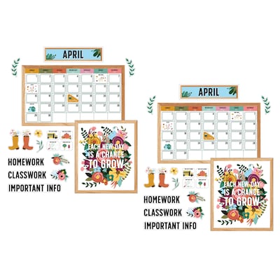 Teach your students essential calendar skills while staying organized with the Carson Dellosa Grow Together Calendar Bulletin Board Set! Perfect for bulletin board, cork board, white board displays, and more, each 134-piece classroom supplies set includes a 23" x 14" wall calendar with monthly, homework, classwork, and important info headers ranging in size from 11" x 6"—13" x 3.4", 2.7" x 2" numbers, birthday, holiday, special occasion, and blank cover ups, a 16" x 13.7" motivational poster, and plant décor, flower décor, and rainboot bulletin board cutouts. Sold as a pack of 2 complete calendar bulletin board sets.