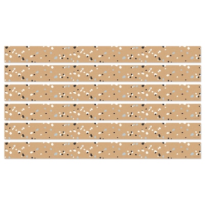 Add natural classroom décor to your learning space using Carson Dellosa We Belong Speckled Kraft Paper Bulletin Board Borders—perfect for bulletin board, white board, cork board, and other classroom décor. Each bulletin board paper set includes 12 strips of straight, natural borders with a colorful, speckled design throughout each strip of border. Each strip of neutral bulletin board border measures 3' x 3" for a total of 36 feet to decorate doors and wall displays, cubbies, chalkboards, and other border needs. Sold as 6 packs for a total of 72 strips (216 feet).