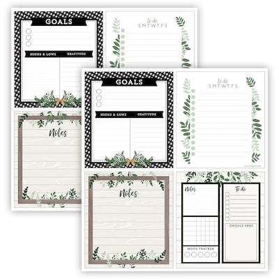 Organize your notes, to do list, and more year-round with a daily planner notepad using Carson Dellosa's Farmhouse Note Pads. The note pad set includes four 50 sheet modern farmhouse notepads with lined paper: one for notes, one for goals & gratitude, a weekly to do list, and one with a small sketch pad section, checklist, and mood tracker. Use the modern farmhouse notepad set a project organizer and homework organizer, create lists, write notes, and more. Each of the note pads measures 5.75" x 6.25"—perfect for classroom organization, a desk notepad, meeting notes, school supplies for college students, and other stationery or work from home essentials. Each set includes 4 notepads. Sold as 2 sets for a total of 8 notepads.