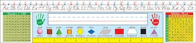 - The perfect reference tool for students to keep at their desks, each nameplate includes: a name line, modern manuscript alphabet (uppercase and lowercase) with stroke lines, 0–30 number line, 11 shapes with names and colors, 12 inch ruler, a hundreds board, addition chart