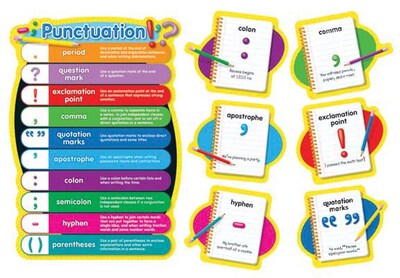 Carson-Dellosa™ "Punctuation" Bulletin board set with writing theme is designed for grades K - 5 and includes a punctuation chart. Set featuring a punctuation chart can be used as resource guide.
