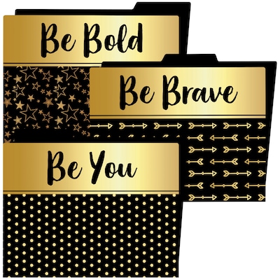 Sparkle + Shine File Folders feature positive messages and gold foil patterns with coordinating solid interiors. This 6-pack includes 2 folders each of these motivational phrases: Be Bold, Be Brave, Be You. Classroom folders offer an easy way to stay organized while showing your sense of style. Easy to personalize, Carson-Dellosa’s file folders are a classroom essential. Measuring 11.75" x 9.5", these folders feature bold patterns and easily add a splash of style to your desk or files. To create a colorful and organized classroom, make sure to view coordinating Sparkle + Shine products.