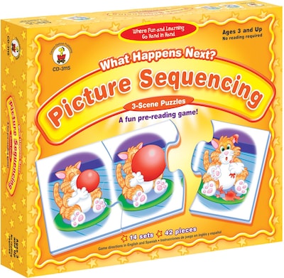 Carson-Dellosa "What Happens Next?" Picture sequencing game is ideal for the age group of 3 and above. Game features 3-peice puzzles and helps to build visual discrimination or sequence skills.